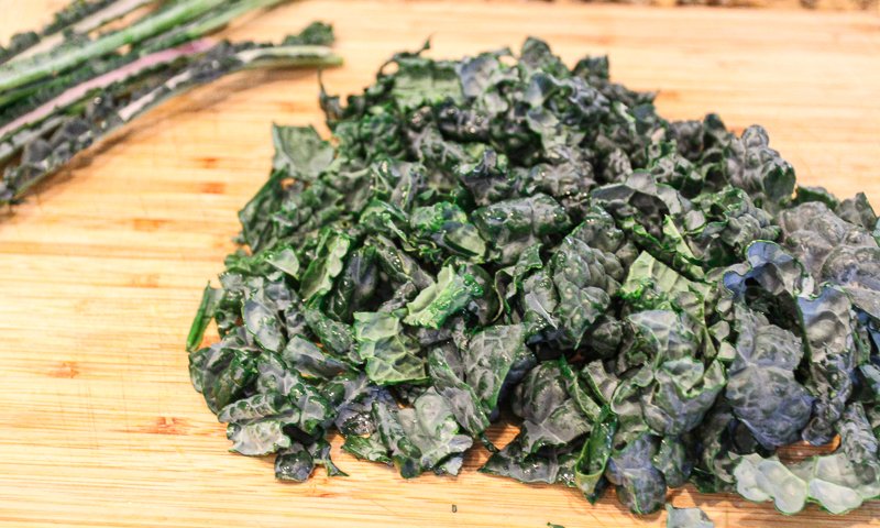 I had 2 kinds of kale because I wasn’t sure how much I would want to put in. I ended up using the darker one (Lacinato Tuscan Kale, aka “dinosaur kale”), which had the perfect texture! The other kind you see there is Curly Kale which is the most common type and you’ve probably seen it in your market! I got these beauties at Underwood Family Farm in Moorpark, CA where I took the boys to pick our own veggies! By the way, the farm is an awesome field trip if you live near Los Angeles!! The white onion is also from the farm!