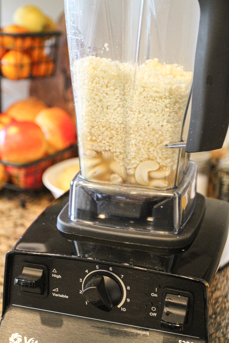 - While the soup starts to simmer, spoon a cup of the liquid into a blender with your 10 oz. of riced cauliflower and 3/4 cup soaked cashews, and blend it up!