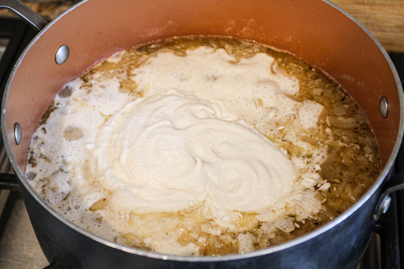 - Blend up the cashews, cauliflower, plus a cup of the broth & add to pot