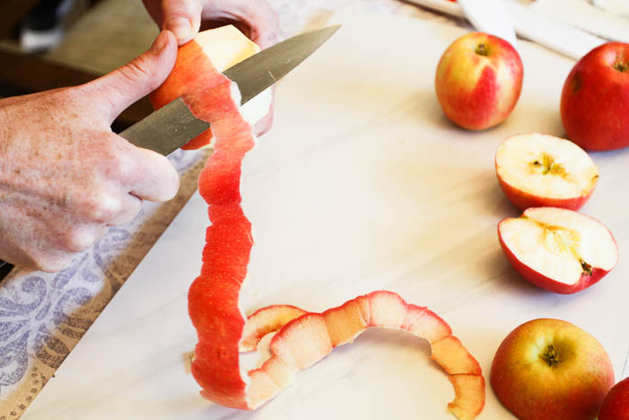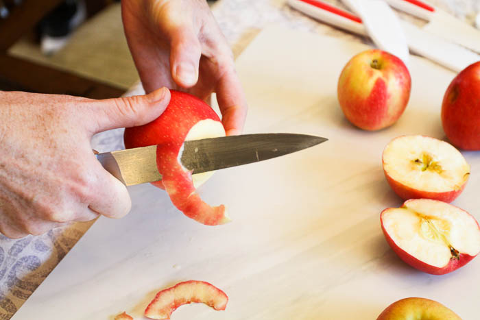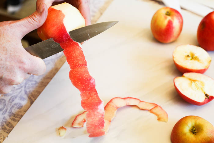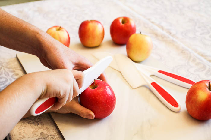 - Peeling apples with a knife is fun but takes practice. Kids will need some help being safe with the knife or you can jump in here and help out!