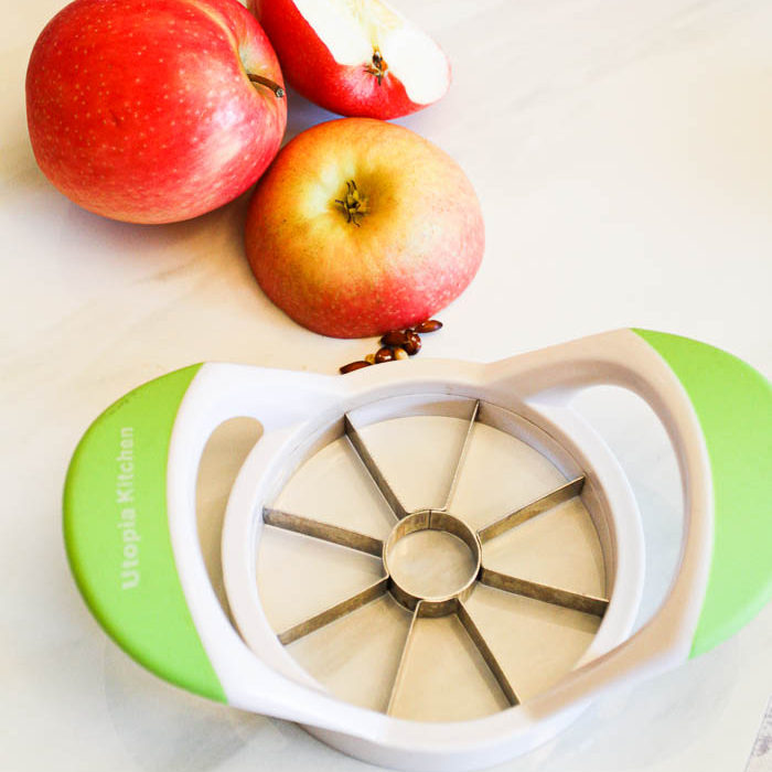- An apple corer is a fun tool but if you don’t have it, don’t sweat it. You can cut out the core and seeds after slicing.