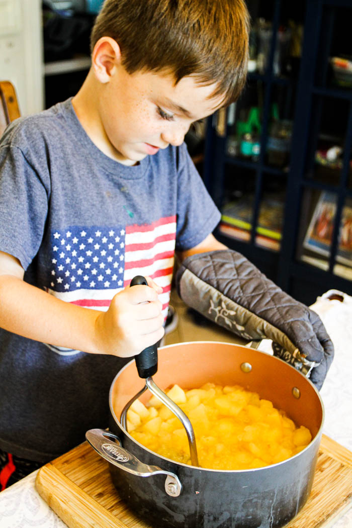 Easy Homemade Applesauce is a great little recipe for kids to start out with when getting comfortable in kitchen. It’s really easy, has only a few ingredients and most kids will at least try it. The coring, peeling and dicing is literally the most complicated part of this fun recipe.